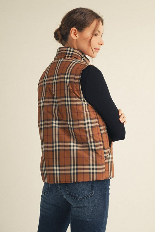 Front zip up plaid padding vest with pockets, neck strap detail. - Model is 5'10'' and is wearing a Small.