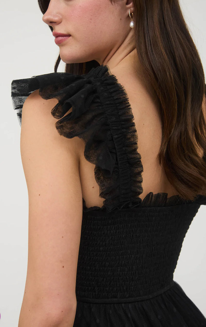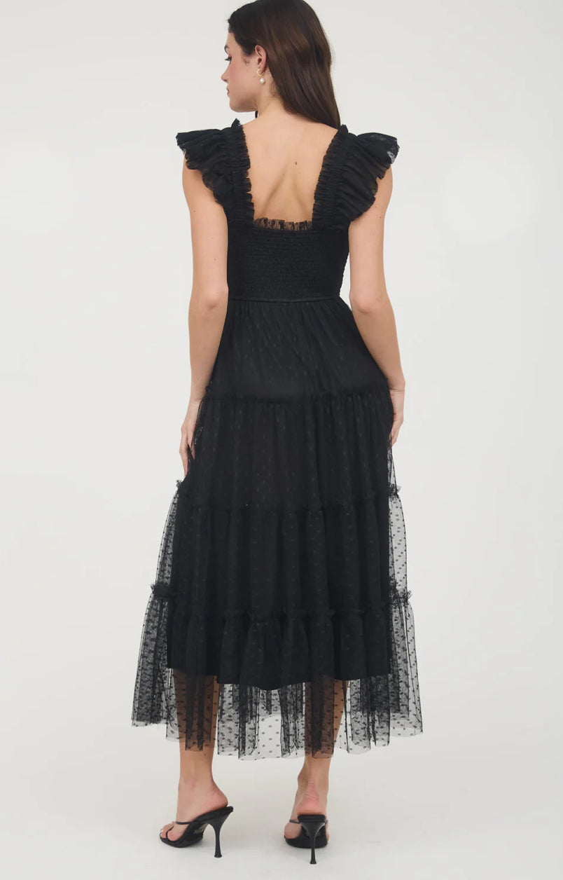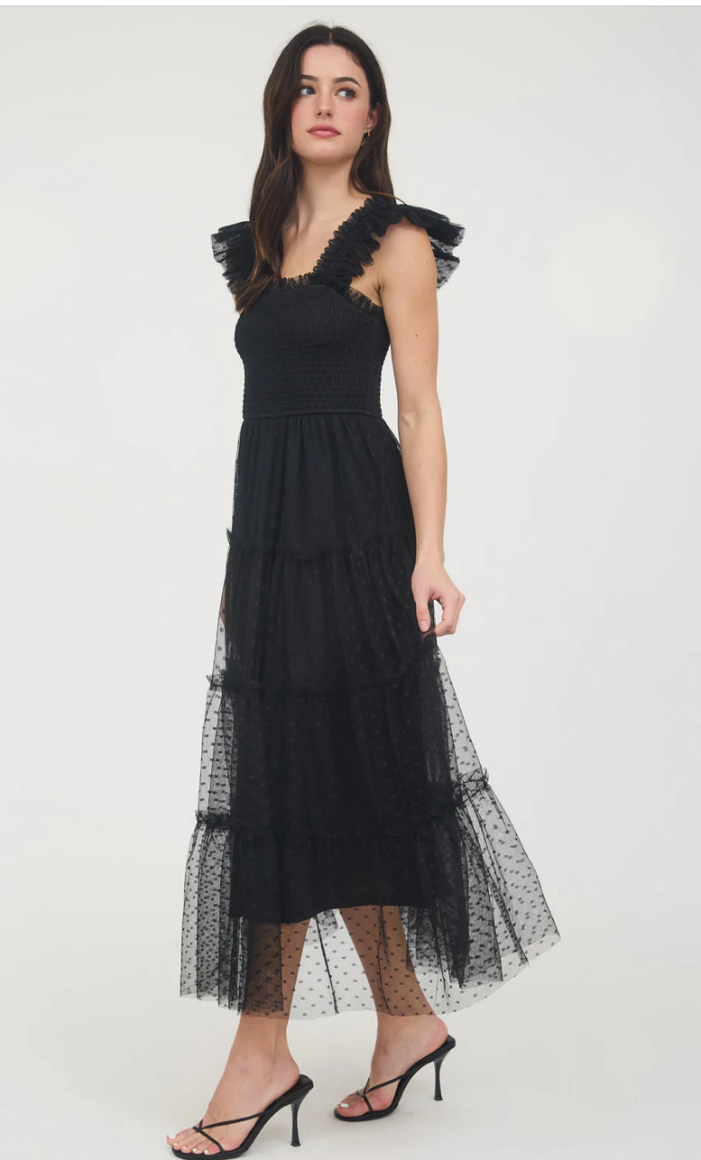 BLACK POLKA DOT CHIFFON SMOCKED TIERED MIDI DRESS