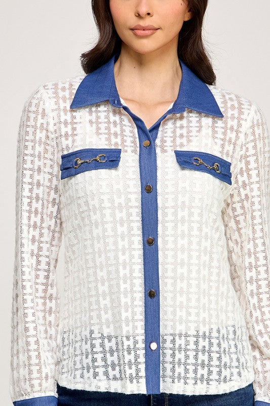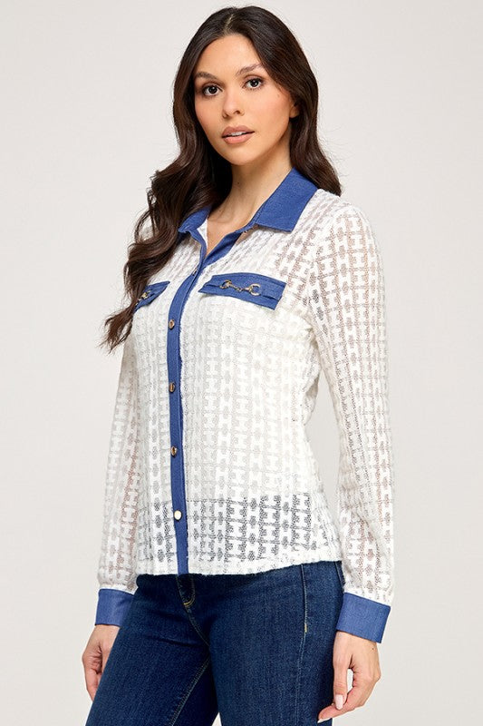 Contrast Detail Lace Long Sleeve Button Down Top with Gold Button