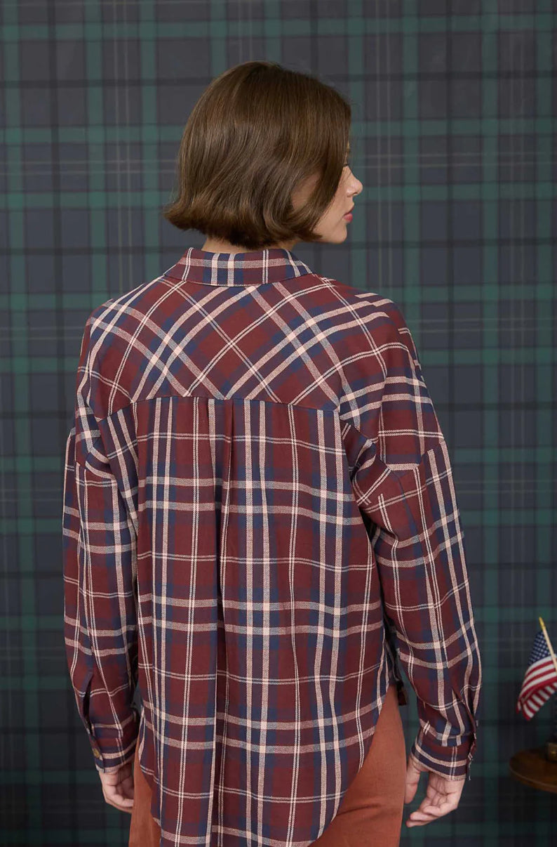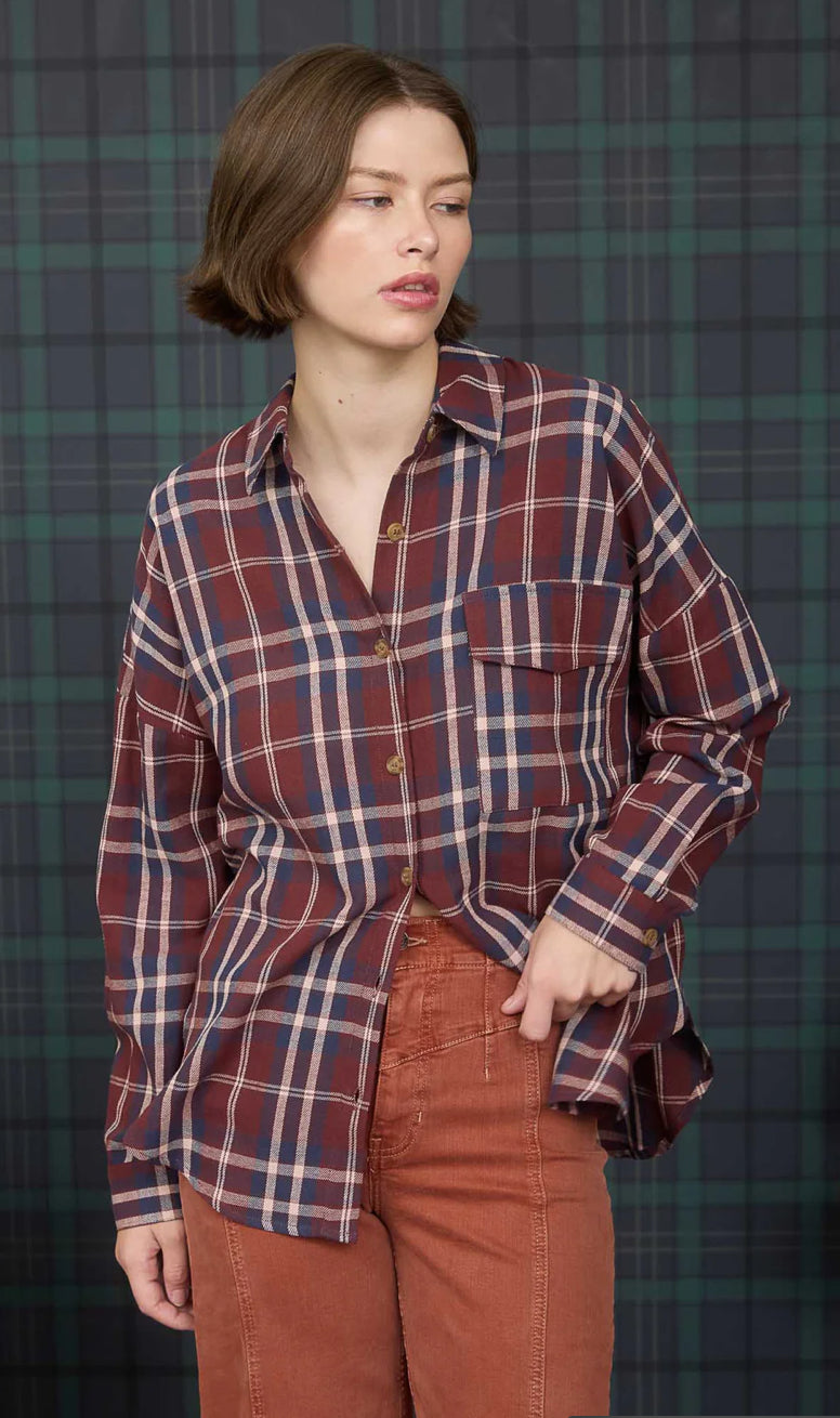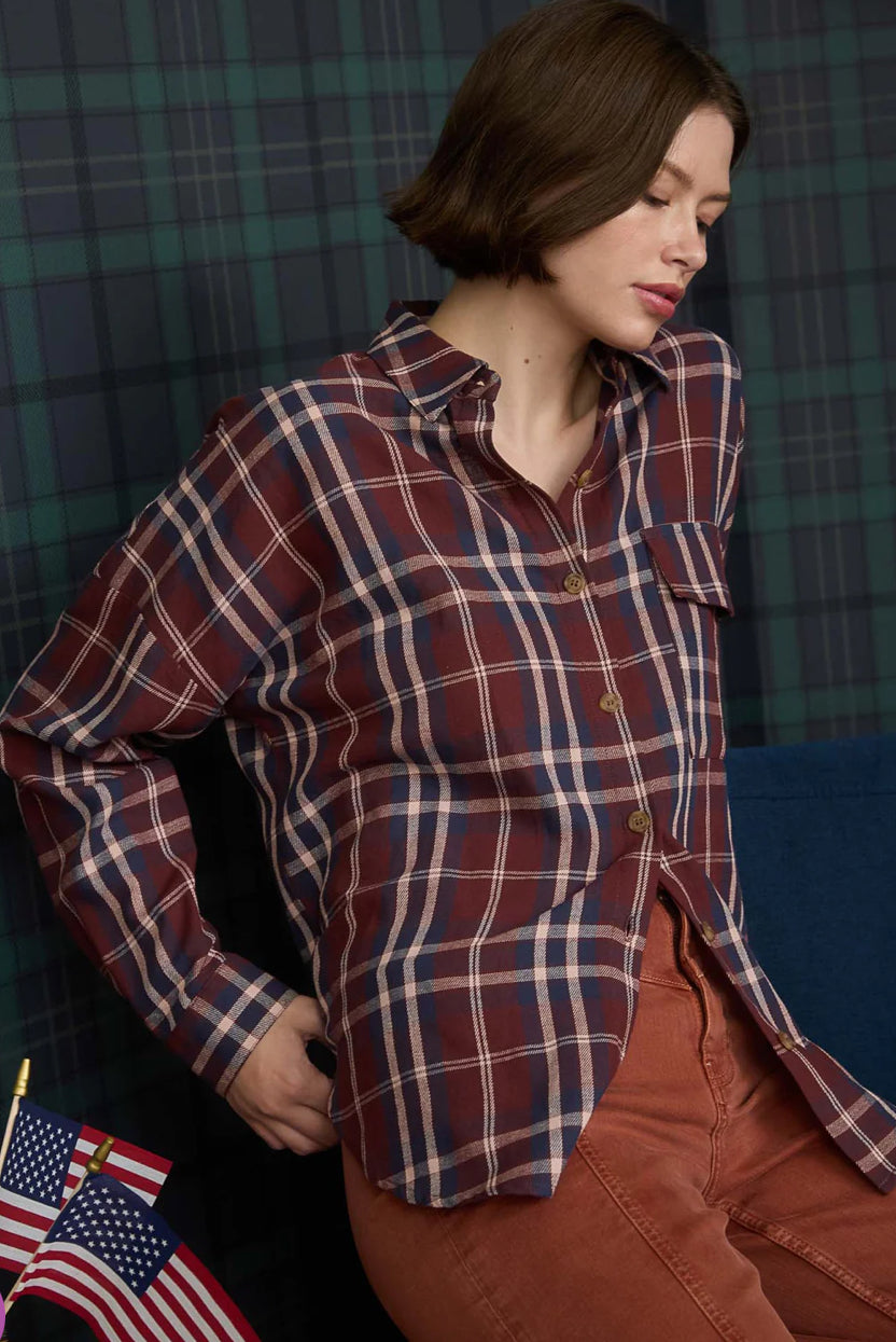 PLAID BUTTON DOWN POCKET DETAIL LONG SLEEVE SHIRT BURGUNDY