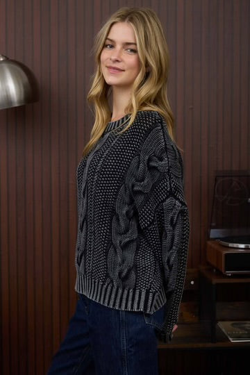 WASHED CABLE KNIT PULLOVER SWEATER - CHARCOAL