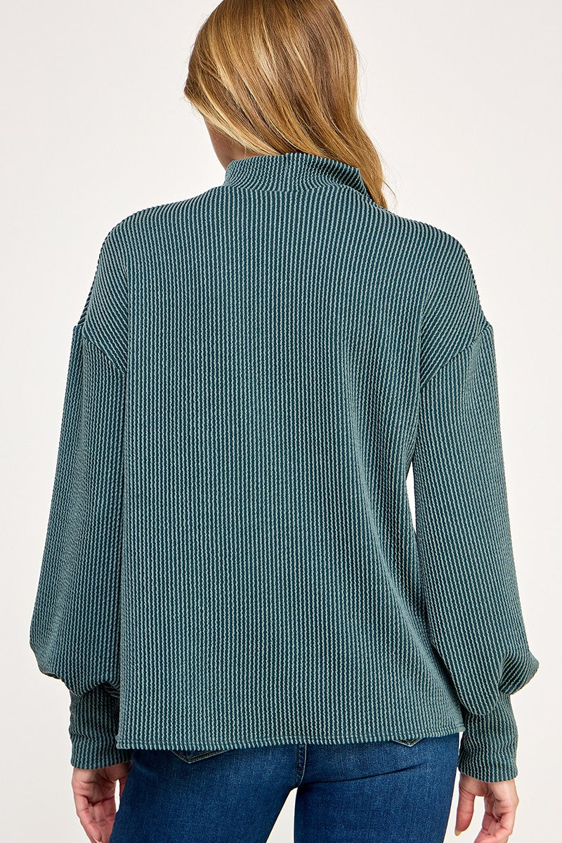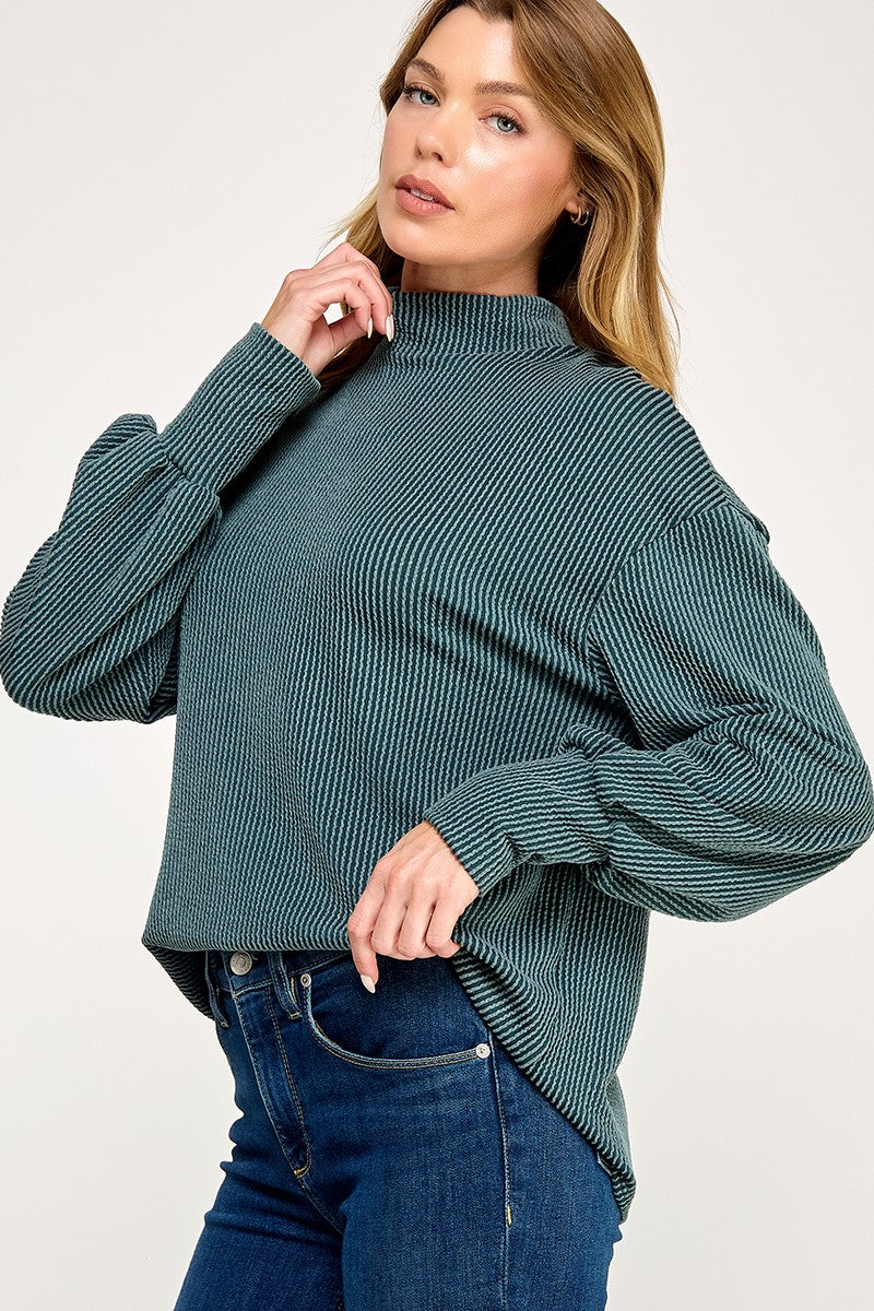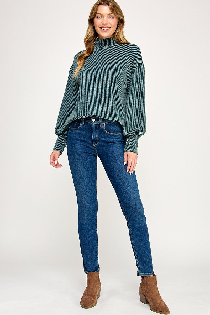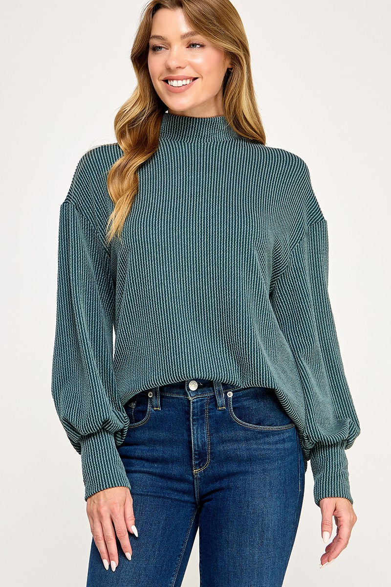 Curly rib mock neck sweater Long bishop sleeve w/ cuffs Relaxed fit Curly rib sweater knit fabric, good stretch Devin is 5'8" Bust 32 - Waist 24 - Hips 34 Here she's wearing a size S Size S HPS Length is 27"